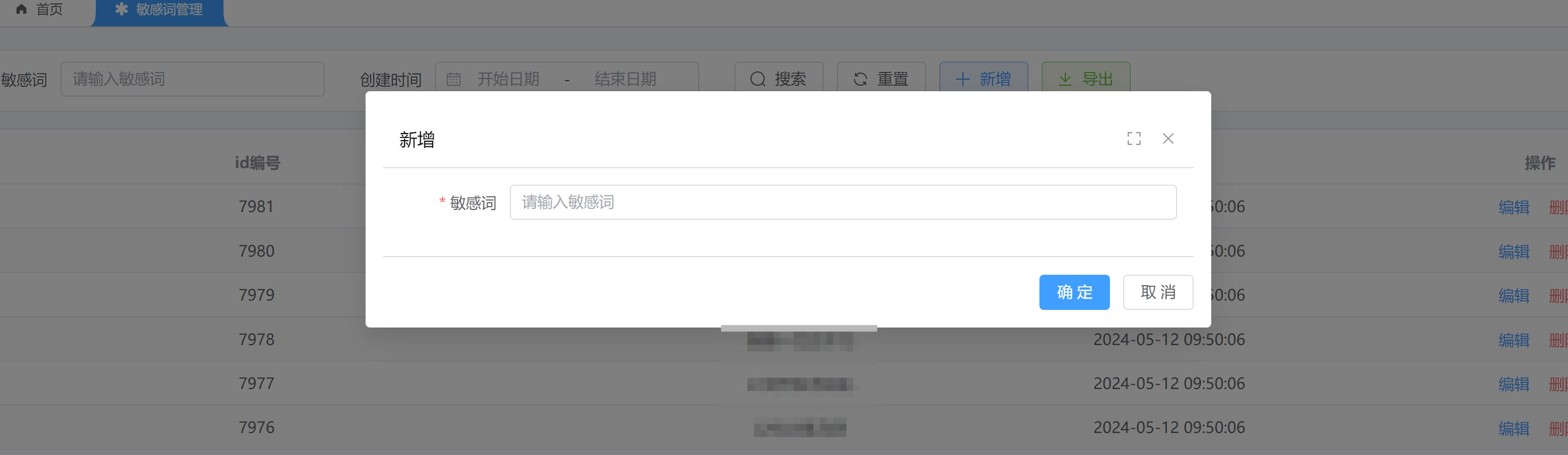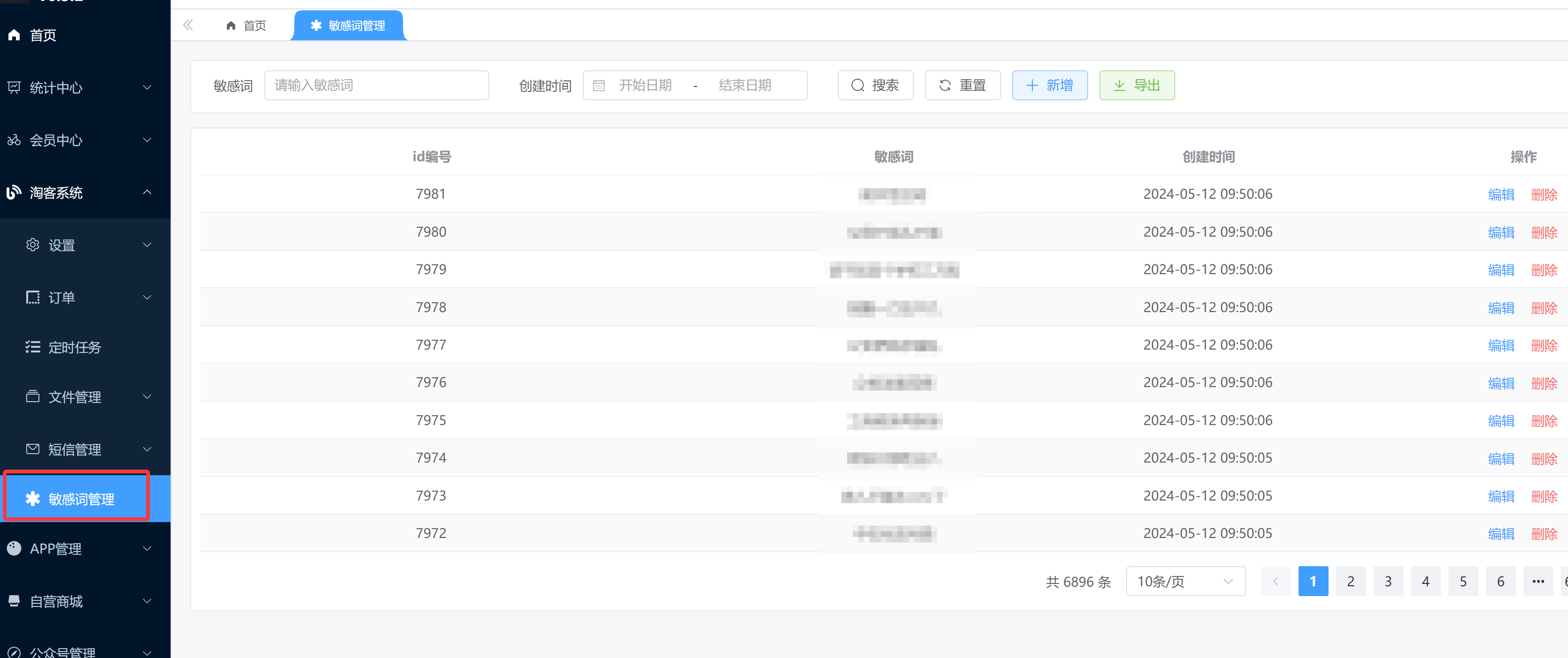 对应的管理后台,可以在 [系统管理 -> 敏感词] 菜单,进行敏感词的管理。如下图所示: