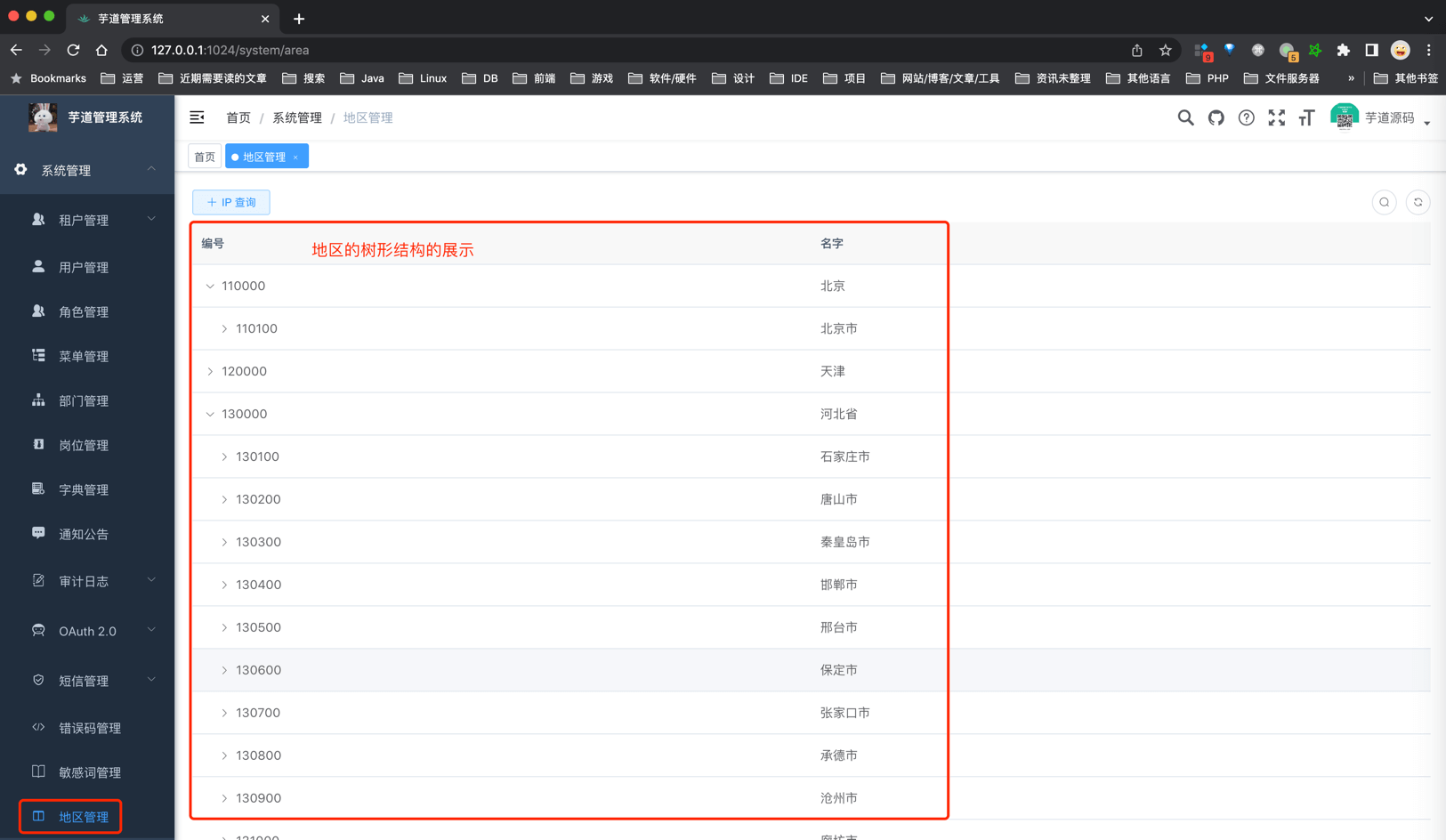 另外,管理后台提供了 [系统管理 -> 地区管理] 菜单,可以按照树形结构查看地区列表。如下图所示: