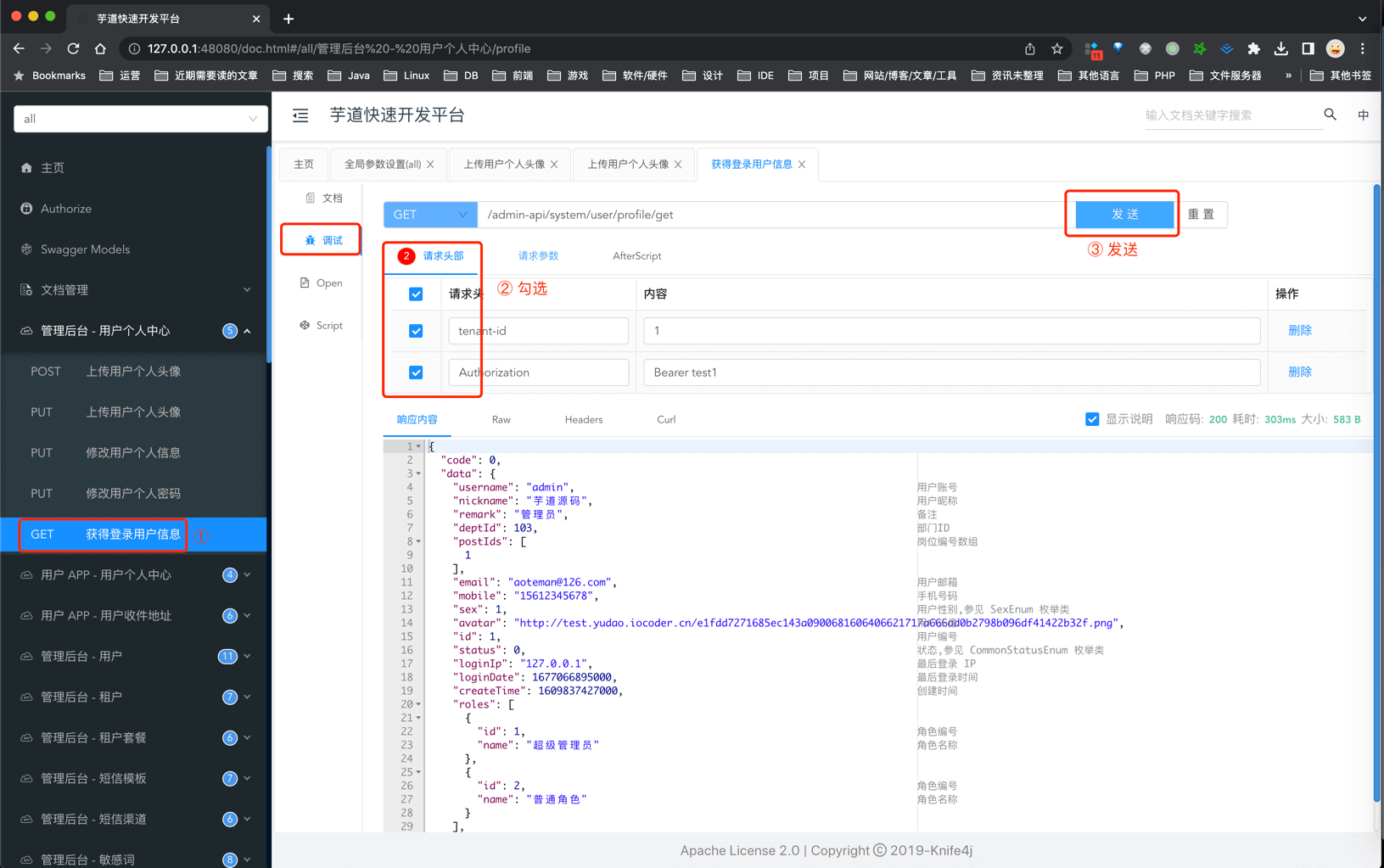 浏览器访问 http://127.0.0.1:48080/doc.html 地址,使用 Knife4j 查看 API 接口文档。