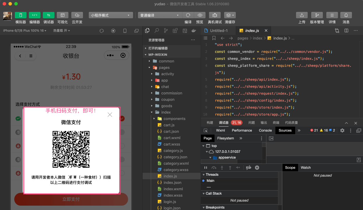 ① 使用微信开发者工具,访问小程序。随便找个商品下单,一路往下走,可以进入“收银台”界面(对应前端项目的 pages/pay/index.vue 文件)。如下图所示: