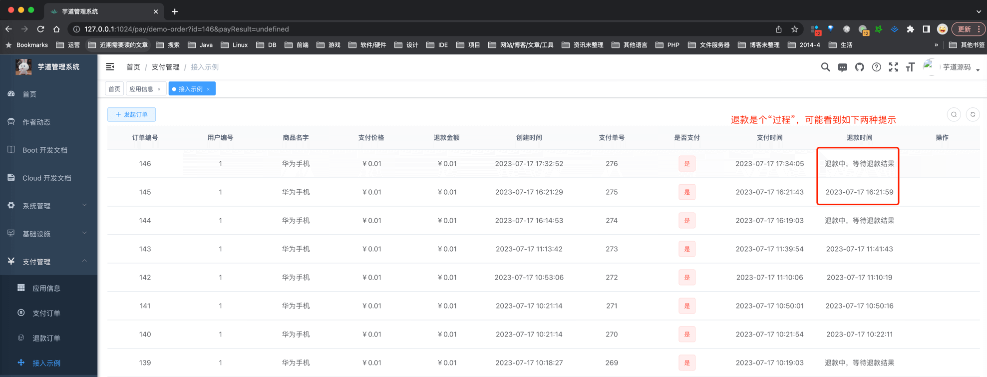 ③ 然后,我们在 [支付管理 -> 支付&退款案例] 菜单,可以看到一个可以“发起退款”的订单。如下图所示: