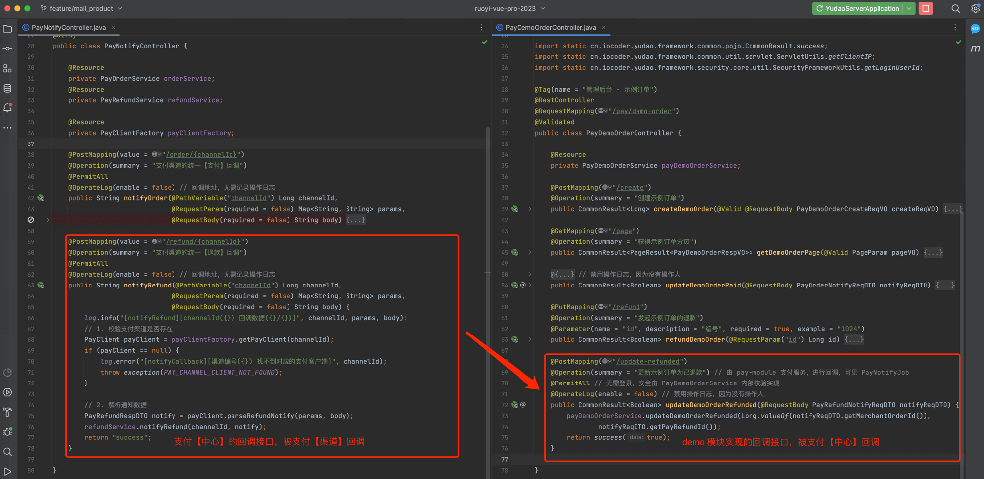 在 demo 模块所在的 yudao-module-xx 模块,实现一个支付回调的接口,提供给支付【中心】回调。对应的代码在 PayDemoOrderController 的 #updateDemoOrderRefunded(...) 方法中,如下图所示: