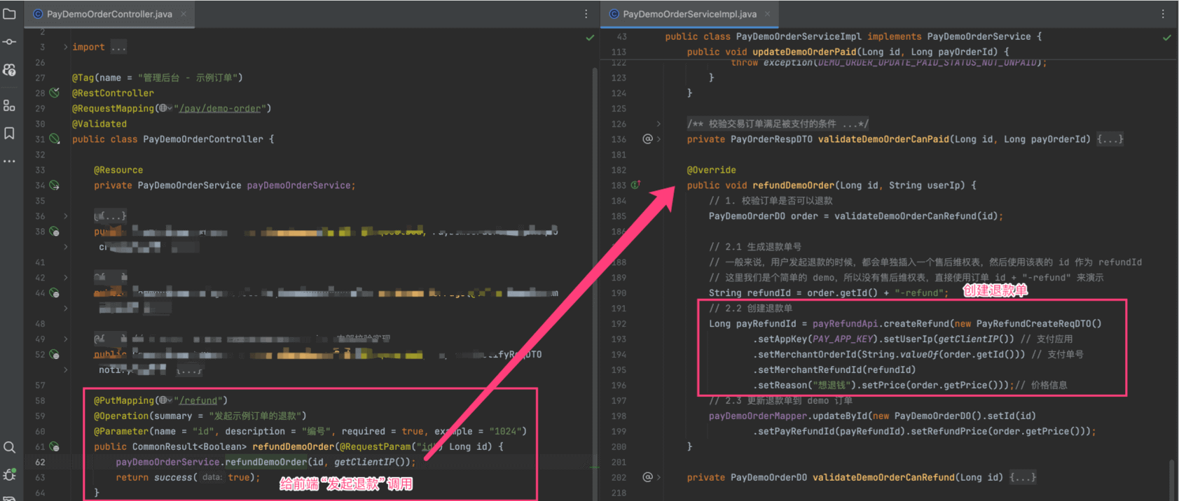 </dependency>② 【后端】在 demo 模块的退款逻辑中,需要调用 PayRefundApi 的 #createRefund(...) 方法,创建退款单。如下图所示: