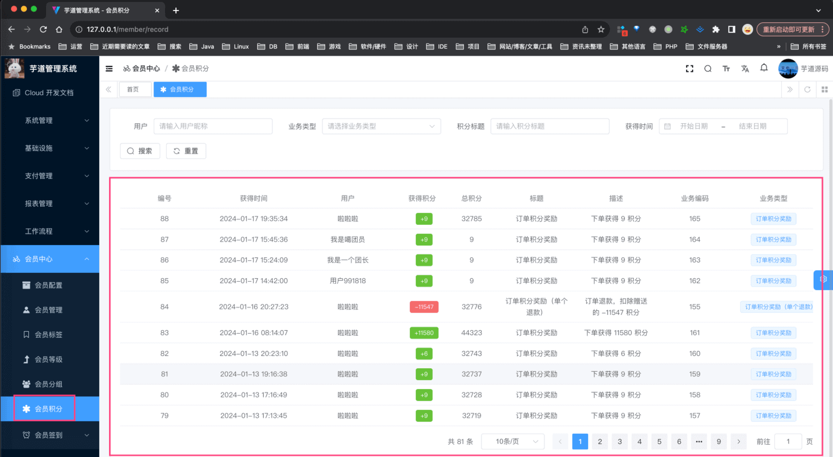 ② 会员详情的 [积分] 标签,可以查看 member_point_record 表的记录,对应 views/member/user/detail/UserPointList.vue 组件。如下图所示: