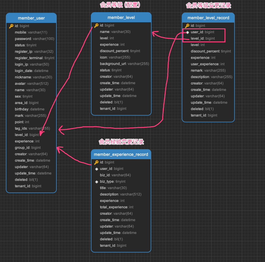 本小节,我们主要看看会员等级、积分、签到相关的表。