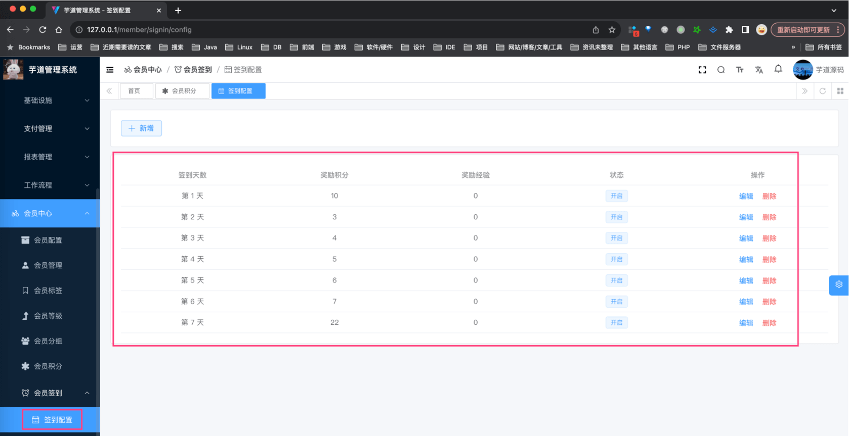 ① 对应 [会员系统 -> 会员中心 -> 会员签到 -> 签到配置] 菜单,对应 yudao-ui-admin-vue3 项目的 views/member/signin/config 目录。如下图所示: