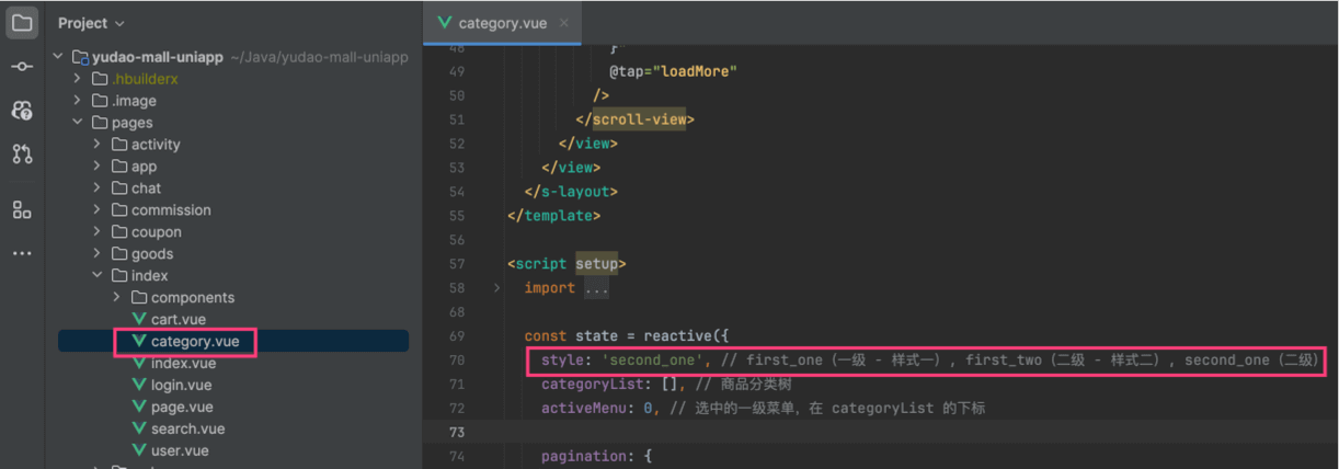 对应 uni-app 底部的 [分类] 导航,对应 yudao-mall-uniapp 项目的 pages/index/category.vue 页面。