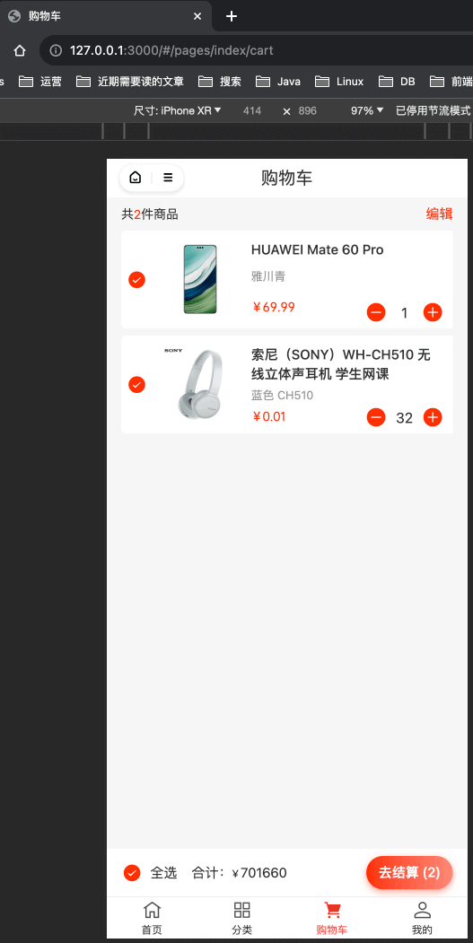 对应 uni-app 底部的 [购物车] 导航,对应 yudao-mall-uniapp 项目的 pages/index/cart.vue 页面。如下图所示: