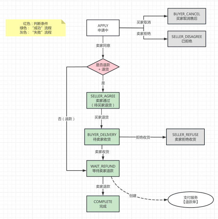 ③ 【状态】status 字段:订单状态,由 AfterSaleStatusEnum 枚举,流转状态如下图: