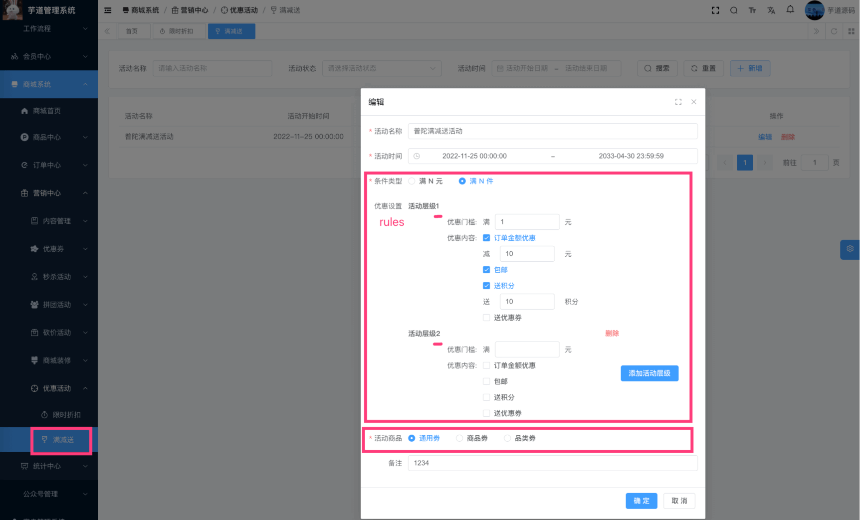 rules 字段:优惠规则的数组,支持多层级,可配置优惠金额、包邮、赠送积分、优惠劵。