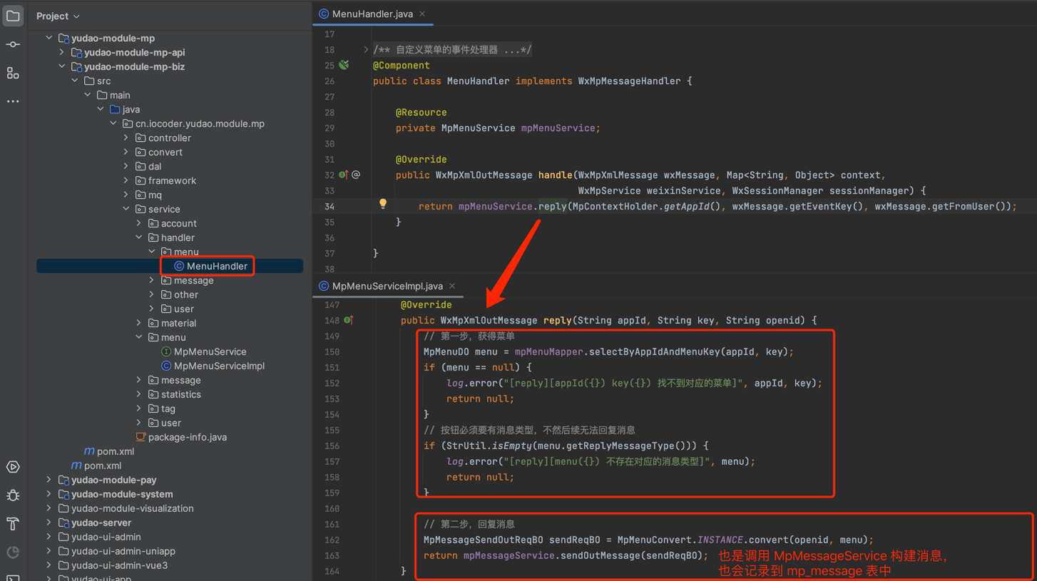 用户点击菜单按钮时,会接收事件消息,进而被 MenuHandler 处理。如果类型为 CLICK 点击回复时,自动回复对应的消息。如下图所示: