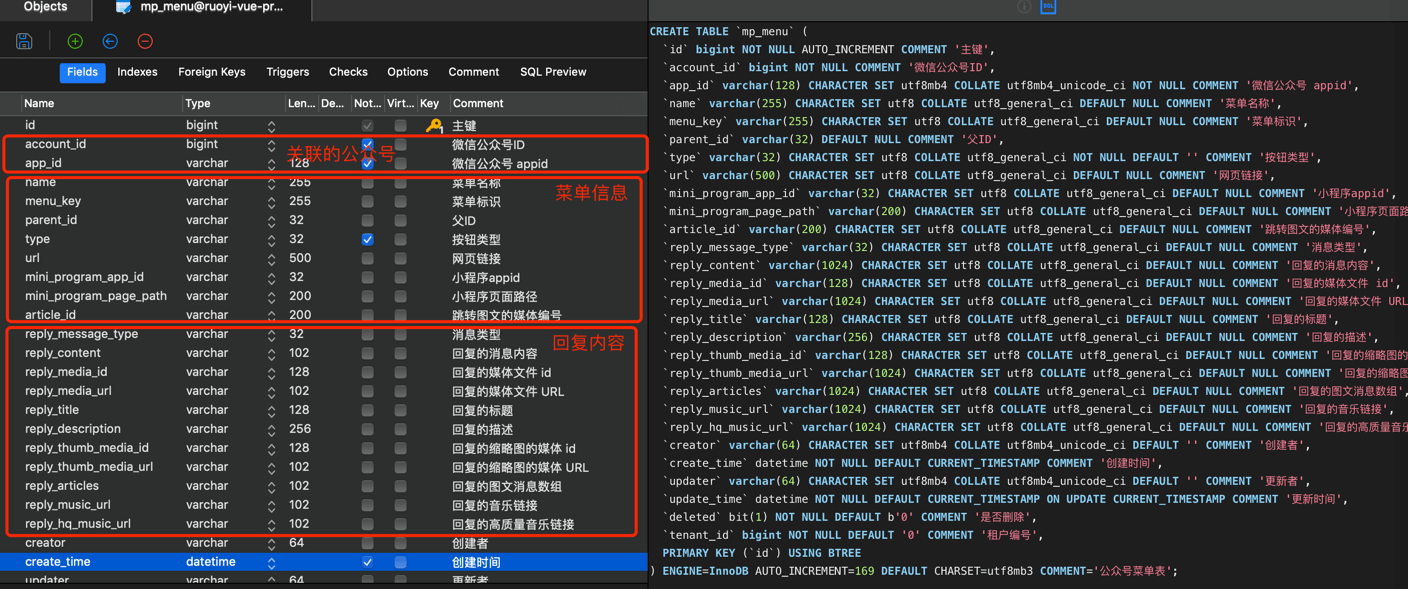 公众号菜单对应 mp_menu 表,结构如下图所示: