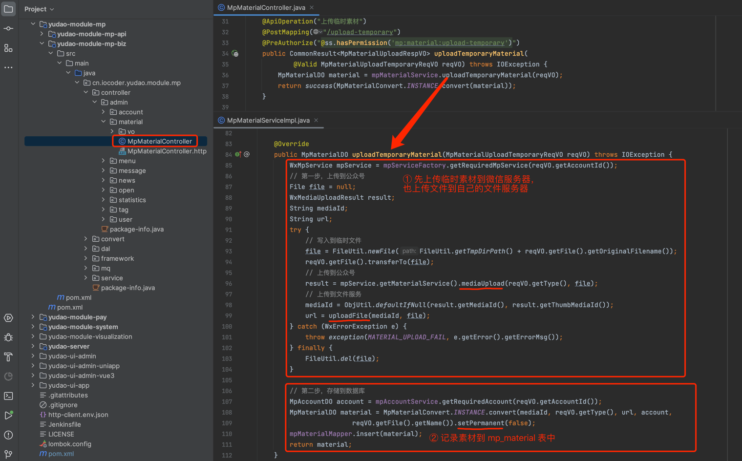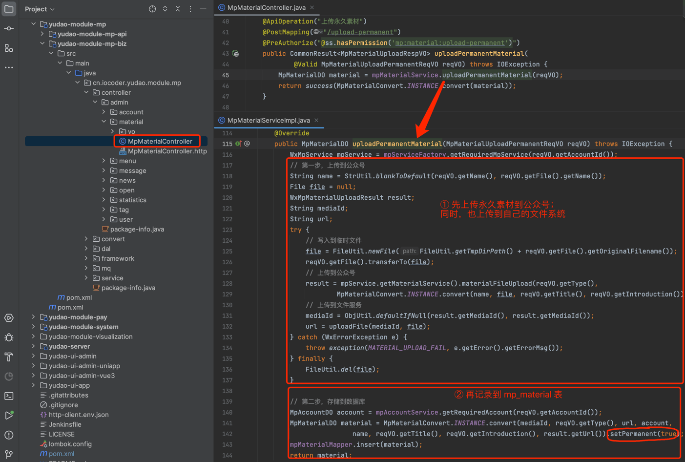 MpMaterialController 的 uploadPermanentMaterial 方法对应的接口,实现了上传【永久】素材到公众号。如下图所示: