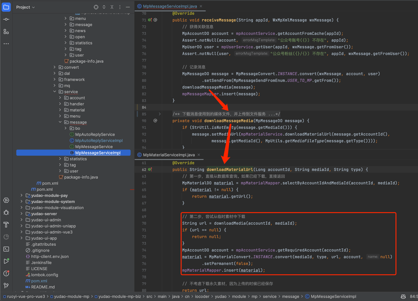 ② 来源二:在接收到用户消息时,如果是图片、语音、视频素材,需要先下载到自己的文件服务器上,避免超过 3 天后无法访问的问题。如下图所示: