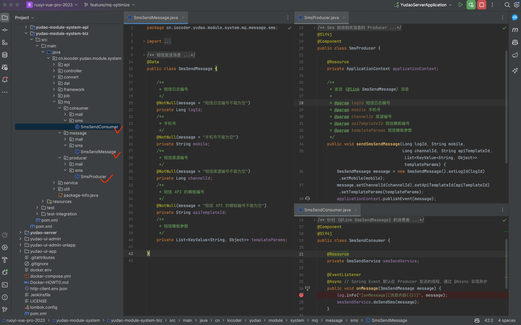 ① Debug 启动后端项目,可以在 SmsProducer 和 SmsSendConsumer 上面打上断点,稍微调试下。