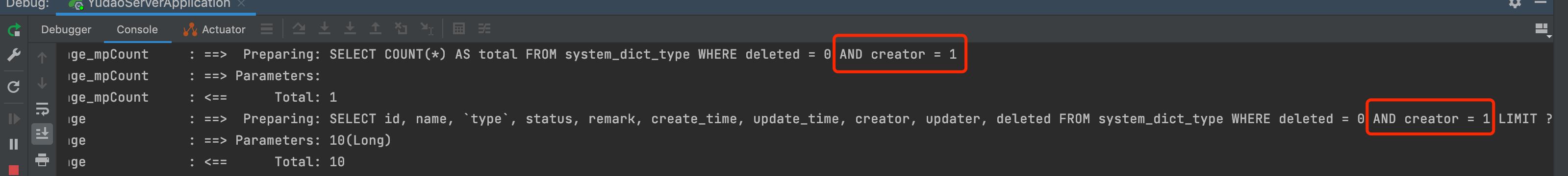 ② 访问 [系统管理 -> 字典管理] 菜单,查看 IDEA 控制台,可以看到 system_dict_type 表的查询自动拼接了 AND creator = 1 的查询条件。