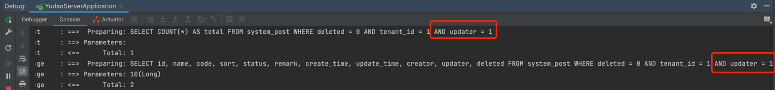 ② 访问 [系统管理 -> 岗位管理] 菜单,查看 IDEA 控制台,可以看到 system_post 表的查询自动拼接了 AND updater = 1 的查询条件。