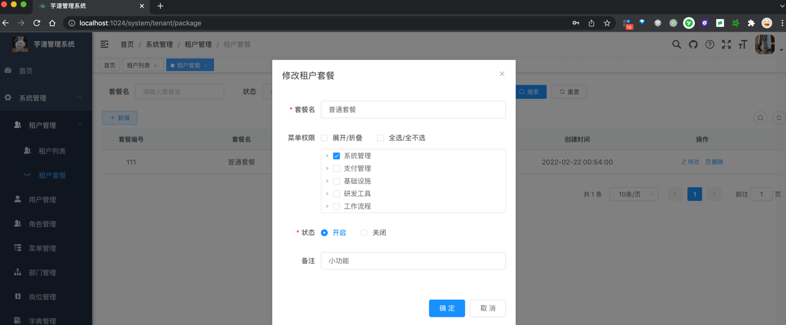 | 租户套餐 | 配置租户套餐,自定每个租户的菜单、操作、按钮的权限 | ![]() | 后端 前端 |