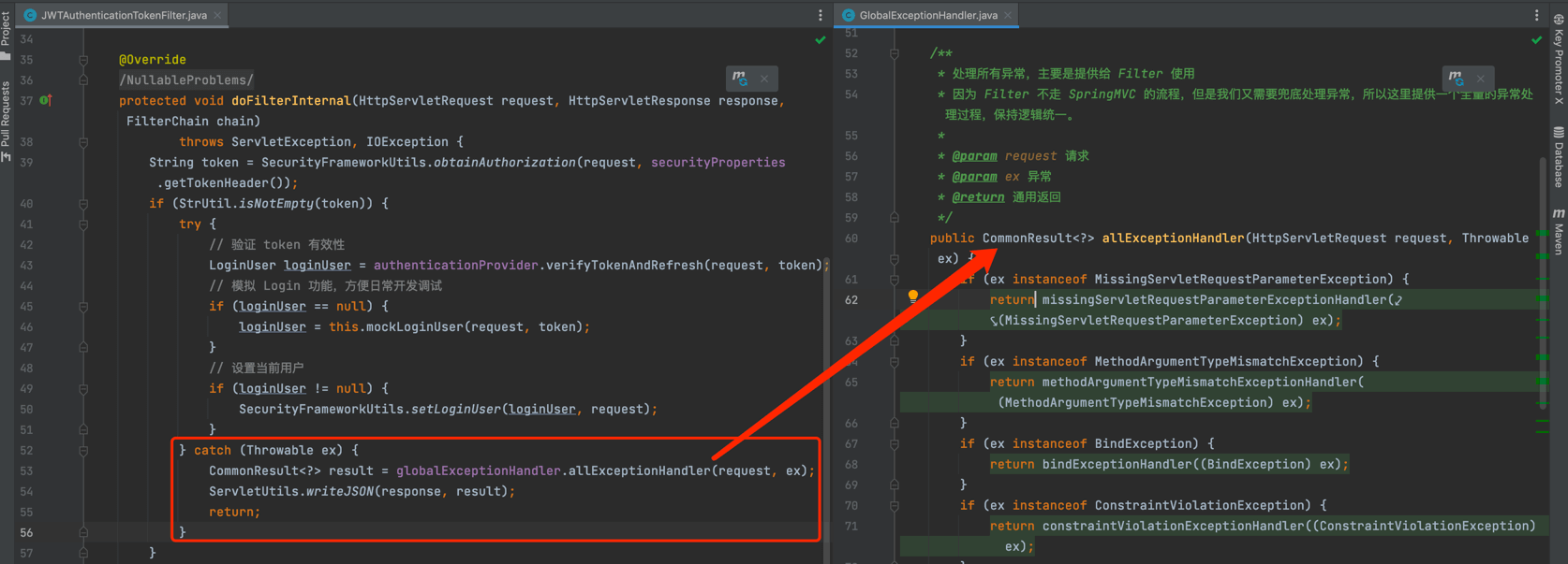 在请求被 Spring MVC 处理之前,是先经过 Filter 处理的,此时发生异常时,是无法通过 @ExceptionHandler 注解来处理的。只能通过 try catch 的方式来实现,代码如下:
