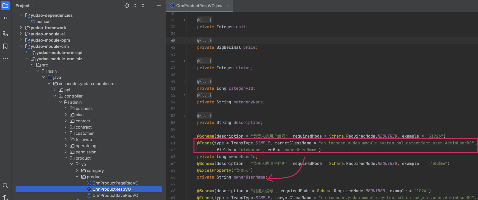 ② 第二步,给 CrmProductRespVO 的 ownerUserId 字段,添加 @Trans 注解,如下图所示: