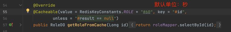 如果你想自定义过期时间,可以在 @Cacheable 注解中的 cacheNames 属性中,添加 #{过期时间} 后缀,单位是秒。如下图所示: