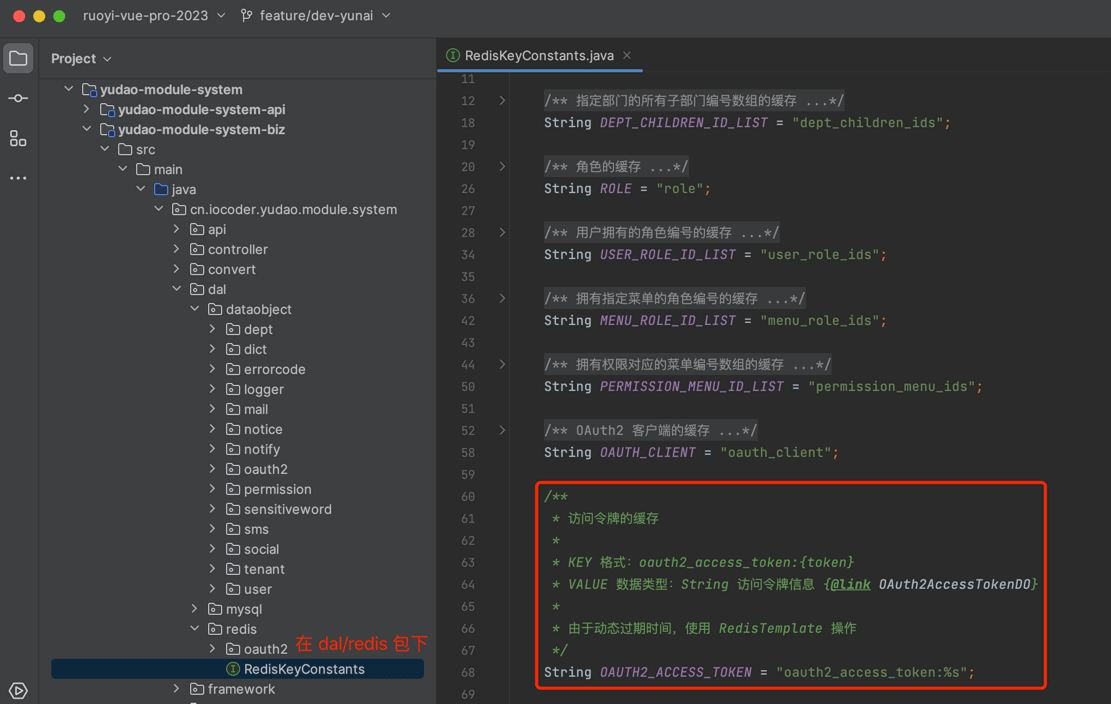 在 yudao-module-system 模块的 RedisKeyConstants 类中,新建 OAuth2AccessTokenDO 对应的 Redis Key 定义 OAUTH2_ACCESS_TOKEN。如下图所示: