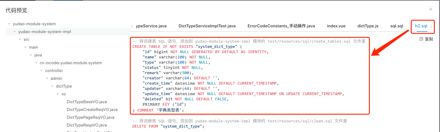 ① 在 create_tables.sql 文件中,添加 system_dict_type 的 H2 建表语句。SQL 如下: