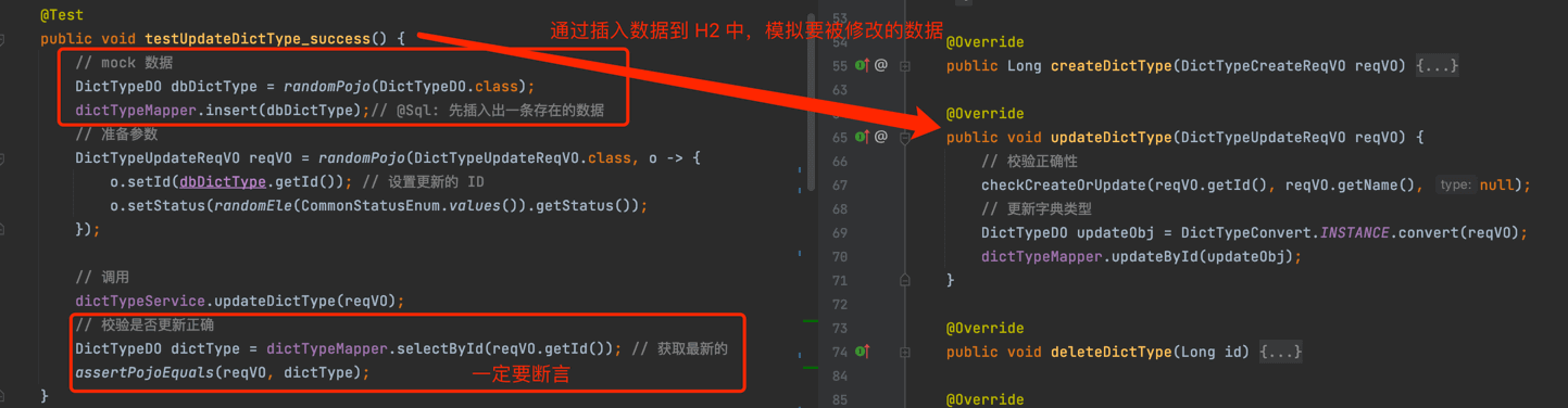 dictDataService是外部依赖,所以需要 Mock 掉。 dictTypeMapper某种程度来说,也是一种外部依赖,但是通过内嵌的 H2 内存数据库,进行“真实”的数据库操作,反而单元测试的编写效率更高,效果更好,所以不需要 Mock 掉。