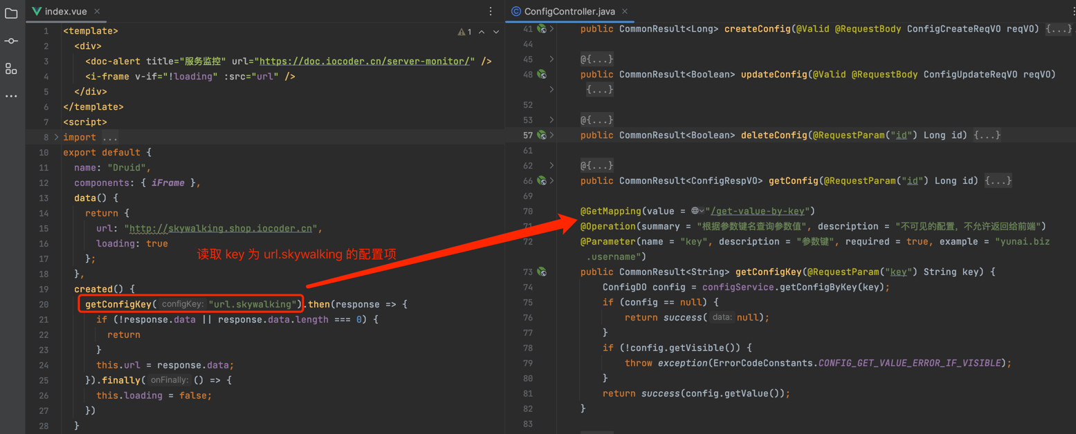 后端提供了 /admin-api/infra/config/get-value-by-key RESTful API 接口,返回指定配置项的值。前端的使用示例如下图: